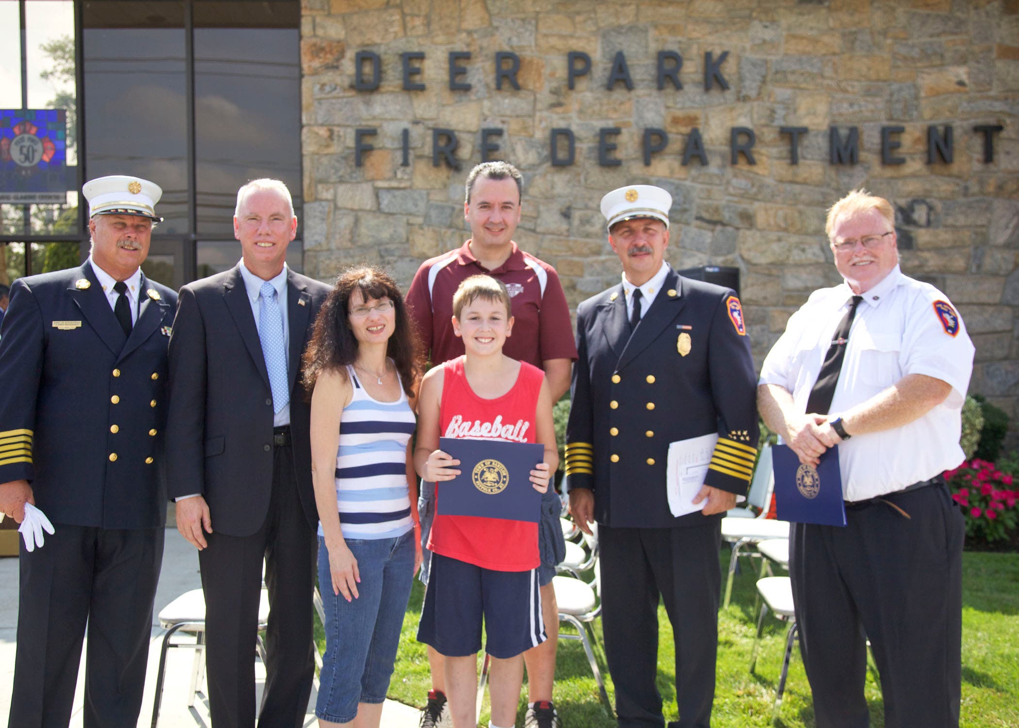 Pictured are Deer Park Fire Department Chief Lawrence Bradbury; Councilman Donnelly; Matthew Heinen and family; Former Chief Thomas Richardson; and Brian Thomas of the Deer Park Fire Department, who accepted the award for his son Joseph.