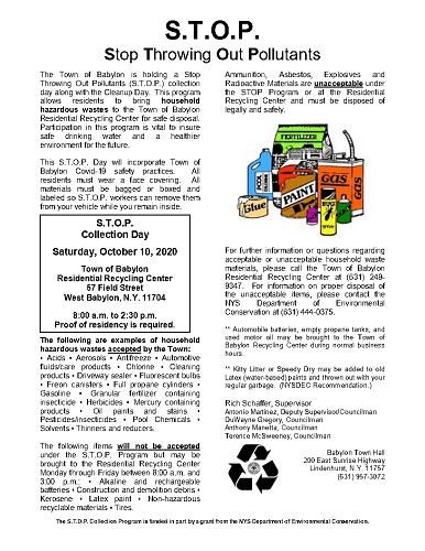 The Town of Babylon is holding a Stop Throwing Out Pollutants (S.T.O.P.) collection day on Saturday, October 10 between the hours of 8:00 AM and 2:30 PM. This program allows residents to bring household hazardous wastes to the Town of Babylon Residential Recycling Center, located at 57 Field Street in West Babylon, for safe disposal. Participation in this program is vital to insure safe drinking water and a healthier environment for the future. Proof of residency is required.