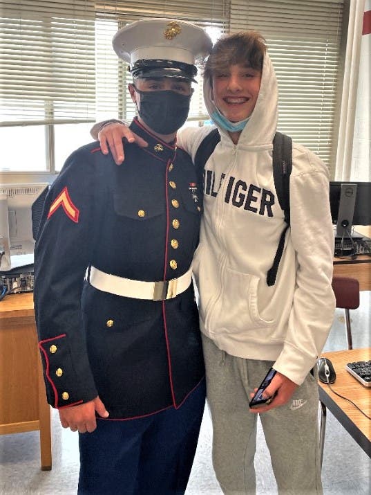 After graduating from high school in 2020, Daniel Busa spent the past year away serving as a Marine. But on April 7, he made his return to surprise his brother, sophomore Dominic Busa.
