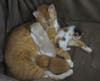 Fiona’s ears and the shape of her face, along with her ballerina-like physique reveal the mix of some special breed, most likely Abyssinian. She is lithe and lean, orange with white throat, belly and paws. She is just barely a year old herself, incredibly playful and extremely demonstrative with her affection. She is full of life, love and vitality.