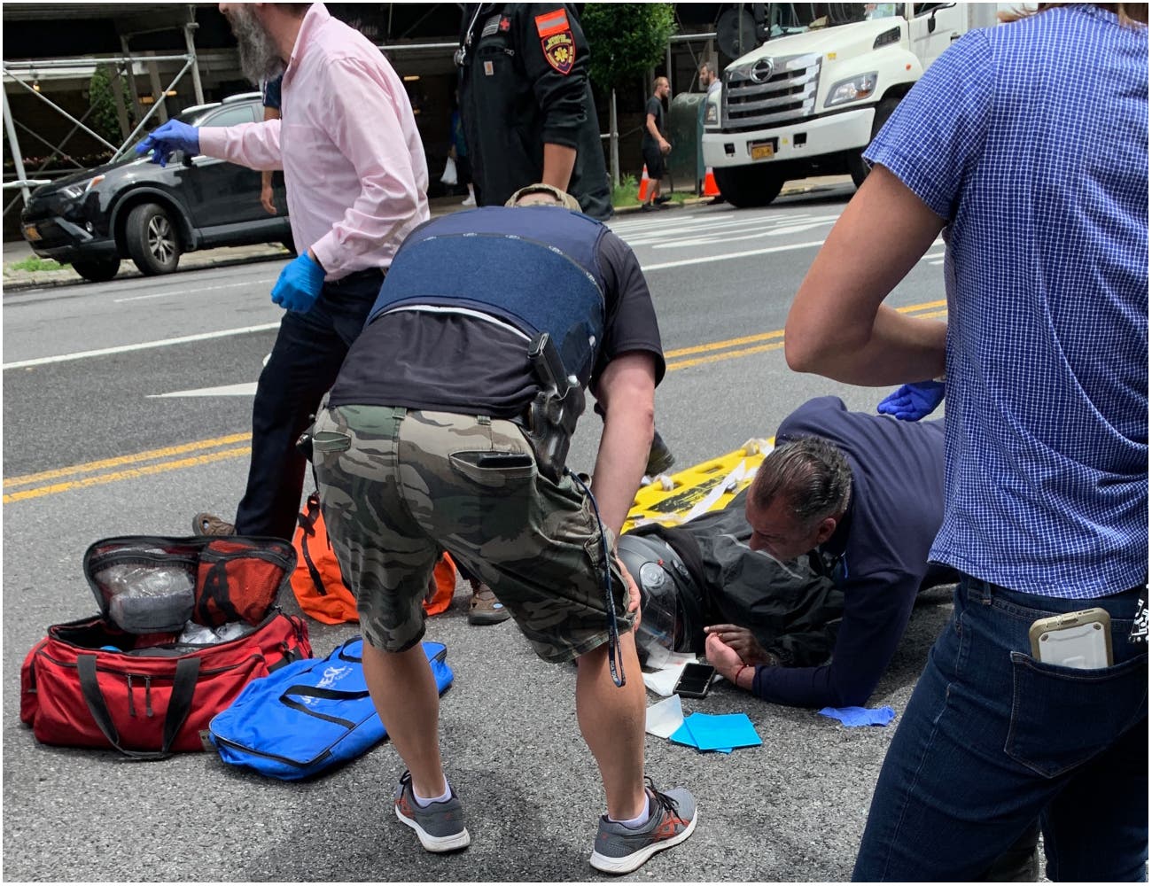 Photos from the scene show the cyclist wearing all-black riding gear and a helmet lying face down on the concrete as a man holds the cyclist's hand and people crowd around them.