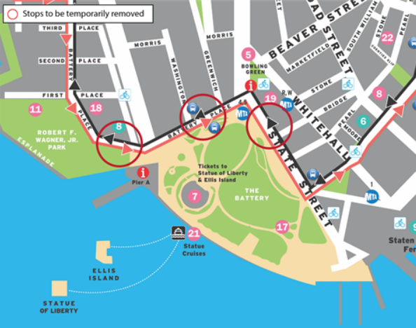 FINANCIAL DISTRICT, NY — The Downtown Alliance Business Improvement District will scrap five bus stops on its free bus route beginning Memorial Day in an effort to stop aggressive ticket sellers who try to scam tourists, the BID announced Thursday.