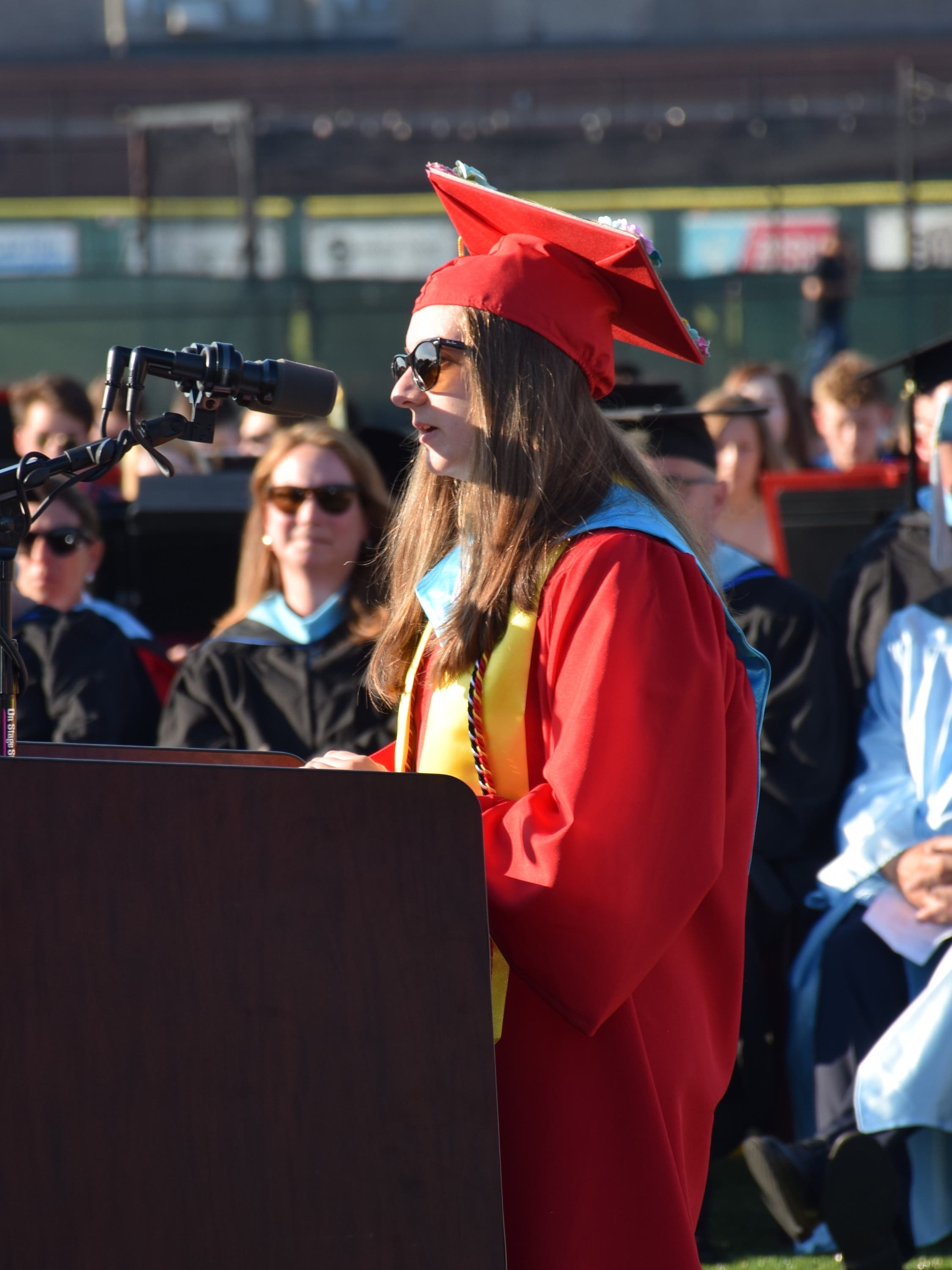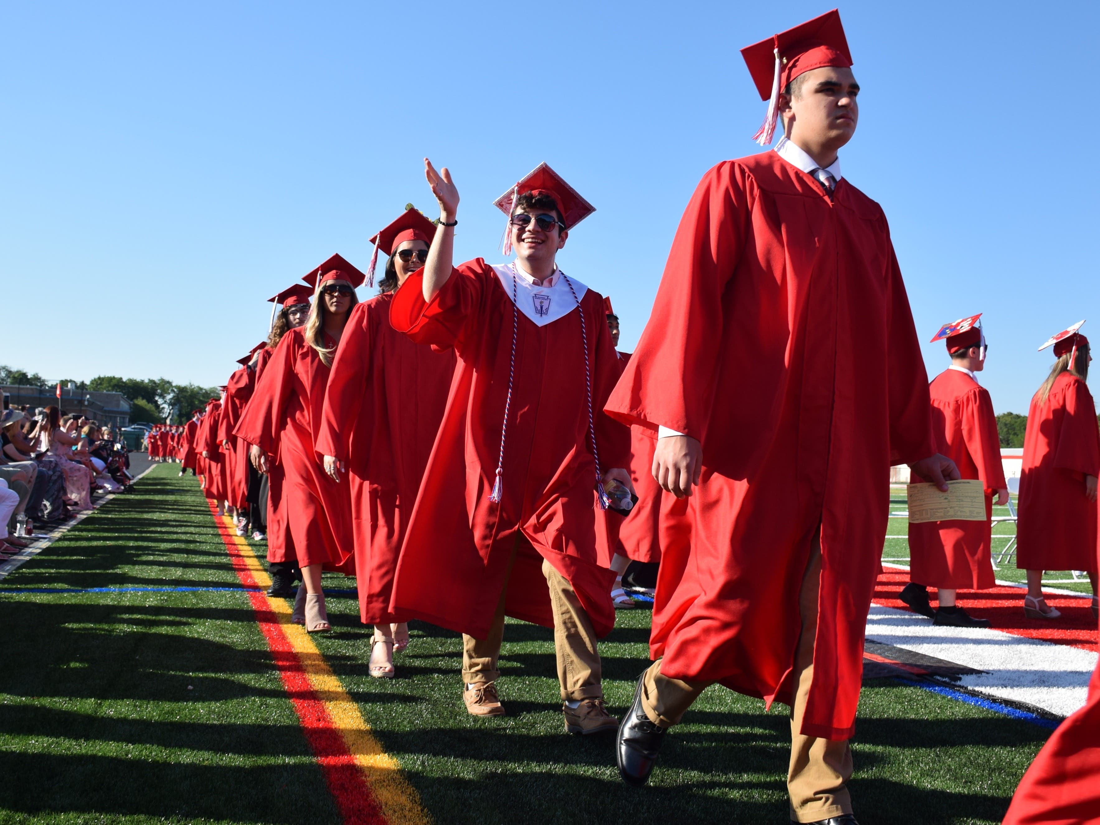 The event began with the seniors filing onto the football field, adorned in red caps and gowns, before Isabella Pasha and Maggie Ruland recited the Pledge of Allegiance and Victoria Tiernan performed the national anthem. In traditional fashion, four students β Alexandra Bertolini, Emily DaSilva, Karina Gallagher and Katelyn Spina β then sang the schoolβs alma mater.
