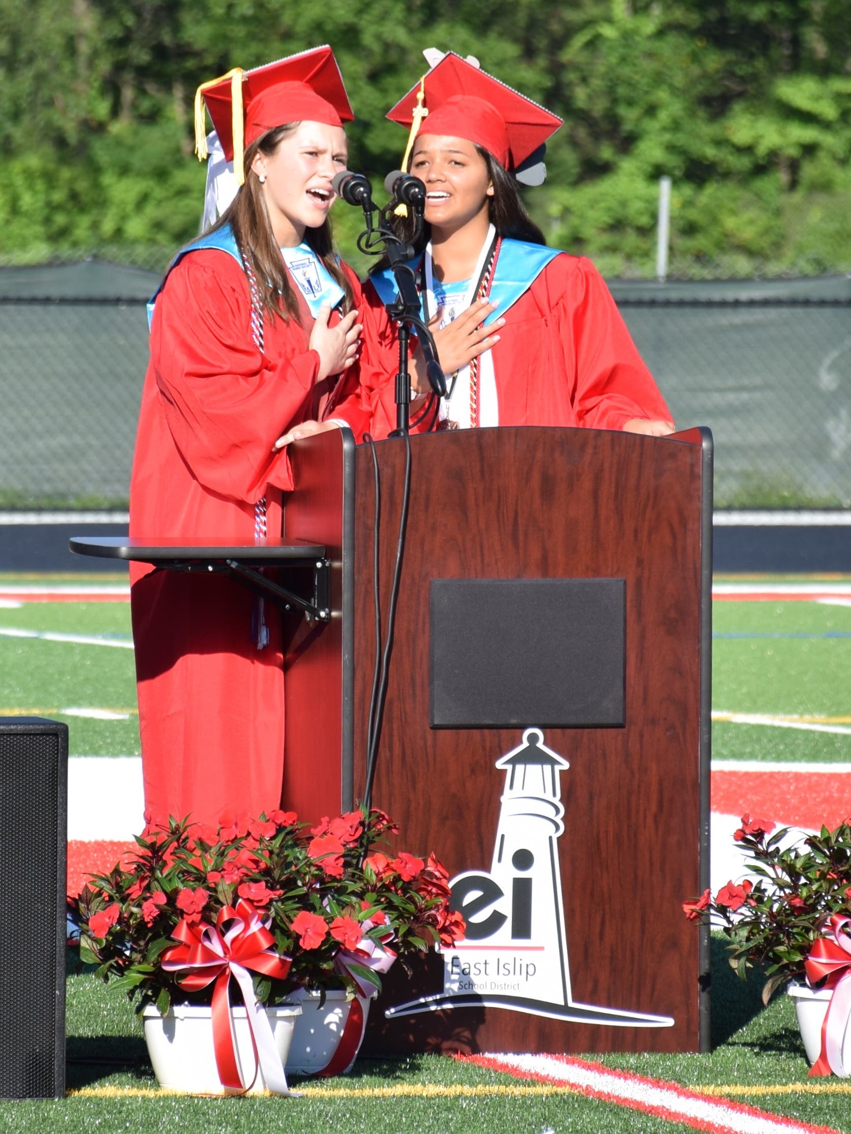 East Islip High School seniors Isabella Pasha and Maggie Ruland recited the Pledge of Allegiance at the 2019 commencement