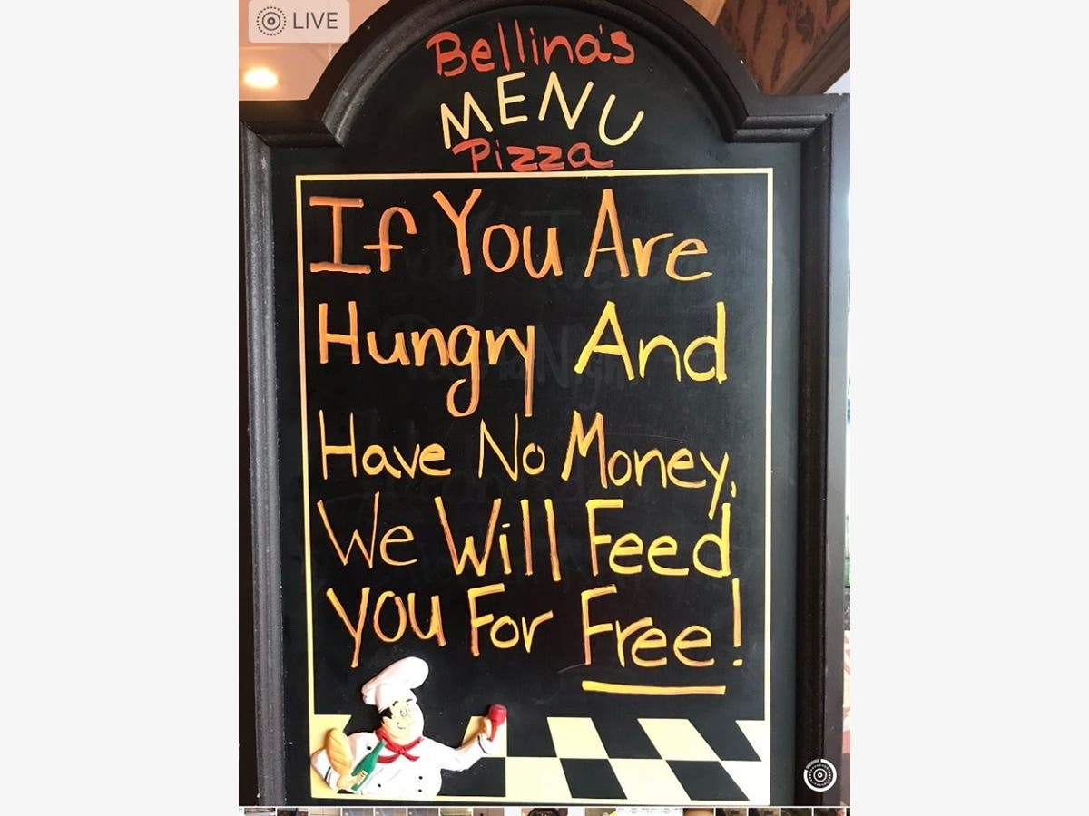 Bellina's Pizzera opened on 22 East Main Street on Nov. 3. Since then, customers have spotted a sign posted in the window of the new restaurant that reads, "If you are hungry, and have no money, we will feed you for free!"