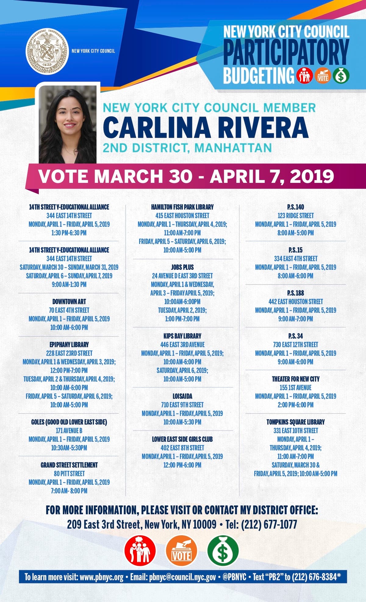 If residents have questions or would like to volunteer during the vote week, contact Rivera's Director of Outreach and Participatory Budgeting, Ivy Ann Rosado, at irosado@council.nyc.gov or 212-677-1077.