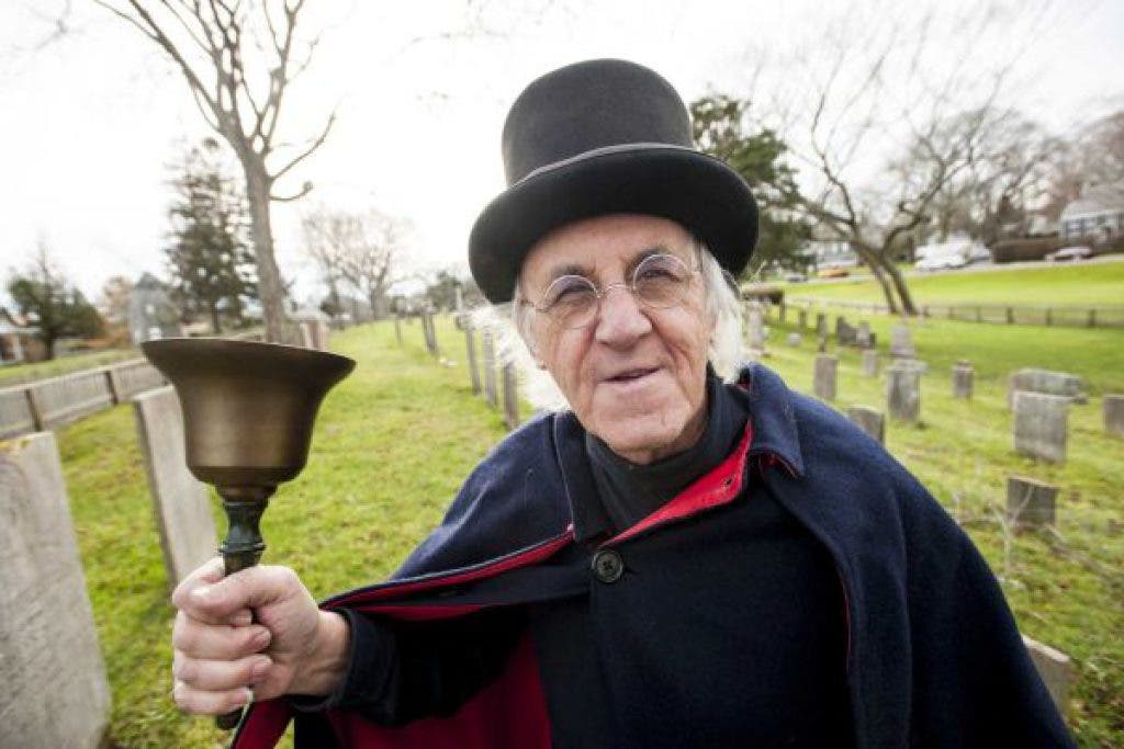 It is hard to miss Hugh King,East Hampton's town crier, as he goes about this bussiness in a cape and Elizabethan top hat.brandishing a brass bell that he rings,loud and clear.Since he's been theΒ crier at town functions for 23 years,few people in the small town haven't crossed paths with Mr. King and found out that he somehow knows more about their background then they do.