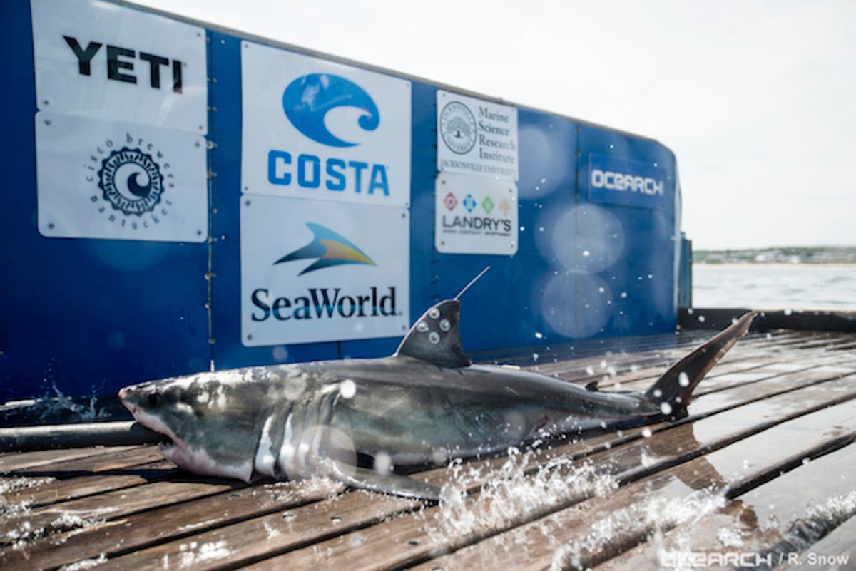 As the sharks' fins breaks the surface, their satellite tags will transmit their location, allowing anyone to follow their movements by accessing the near-real time, free online Global Shark Tracker or by downloading the Global Shark Tracker App available for Apple and Android platforms on the OCEARCH website.