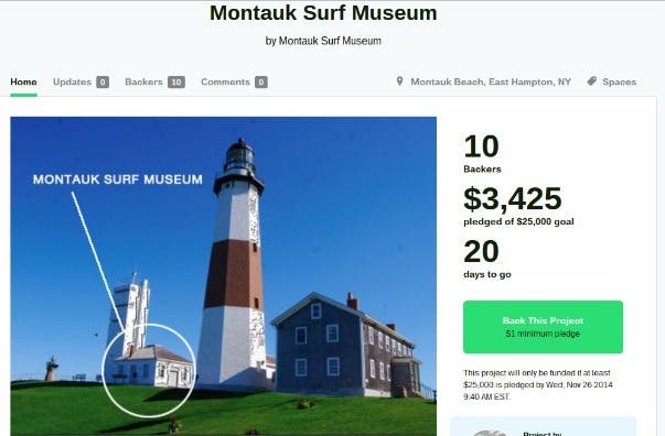 Rewards are offered for certain pledges: those who give $25 or more will receive a limited edition surf pin, those who give $100 or more will get a first edition Montauk Surf Museum notebook, those who pledge $500 or more will receive a Montauk Surf Museum t-shirt and those who pledge $5,000 or more will receive a surf lesson with pro surfer Quincy Davis followed by a lunch at The Ranch.