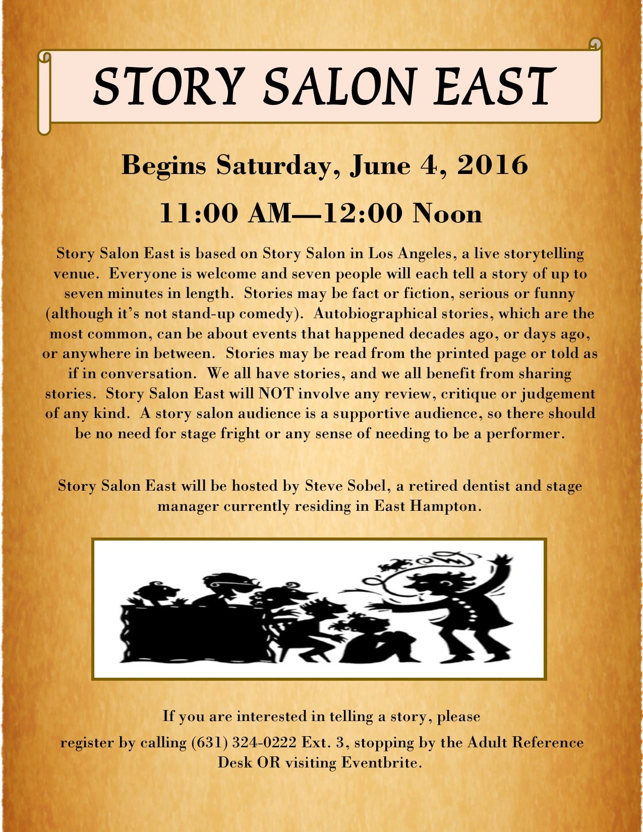 Story Salon East will be hosted by Steve Sobel, a retired dentist and stage manager currently residing in East Hampton.