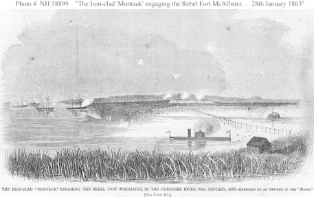 Its first action was the bombardment of Fort McAllister in Georgia during January 1863. The specialty of the ironclad βPassaic typeβ of which both the Montauk and the Monitor were was close range bombardment of targets in harbors such as forts and other patrol boats, or monitoring vessels. The USS Montauk was equipped with a 20 ft in diameter turret which had a pair of Dahlgren guns which used eleven inch Dahlgren smoothbore shell guns, the heaviest available at that time. When it opened fire it was spitting out huge amounts of hot lead in rapid fire.