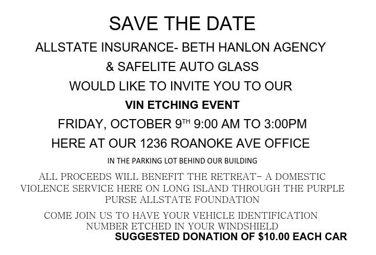 Come join us on Friday, October 9th 2015 from 9am-3pm behind the Beth Hanlon Insurance Agency office to have your vehicle identification number etched in your windshield. $10.00 suggested donation per car.