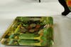 For those unfamiliar, reverse decoupage is the skillful craft of arranging and attaching images beneath a glass surface. Each one of Lambroza’s pieces is a unique creation using materials from Australia, Japan, China and Italy.