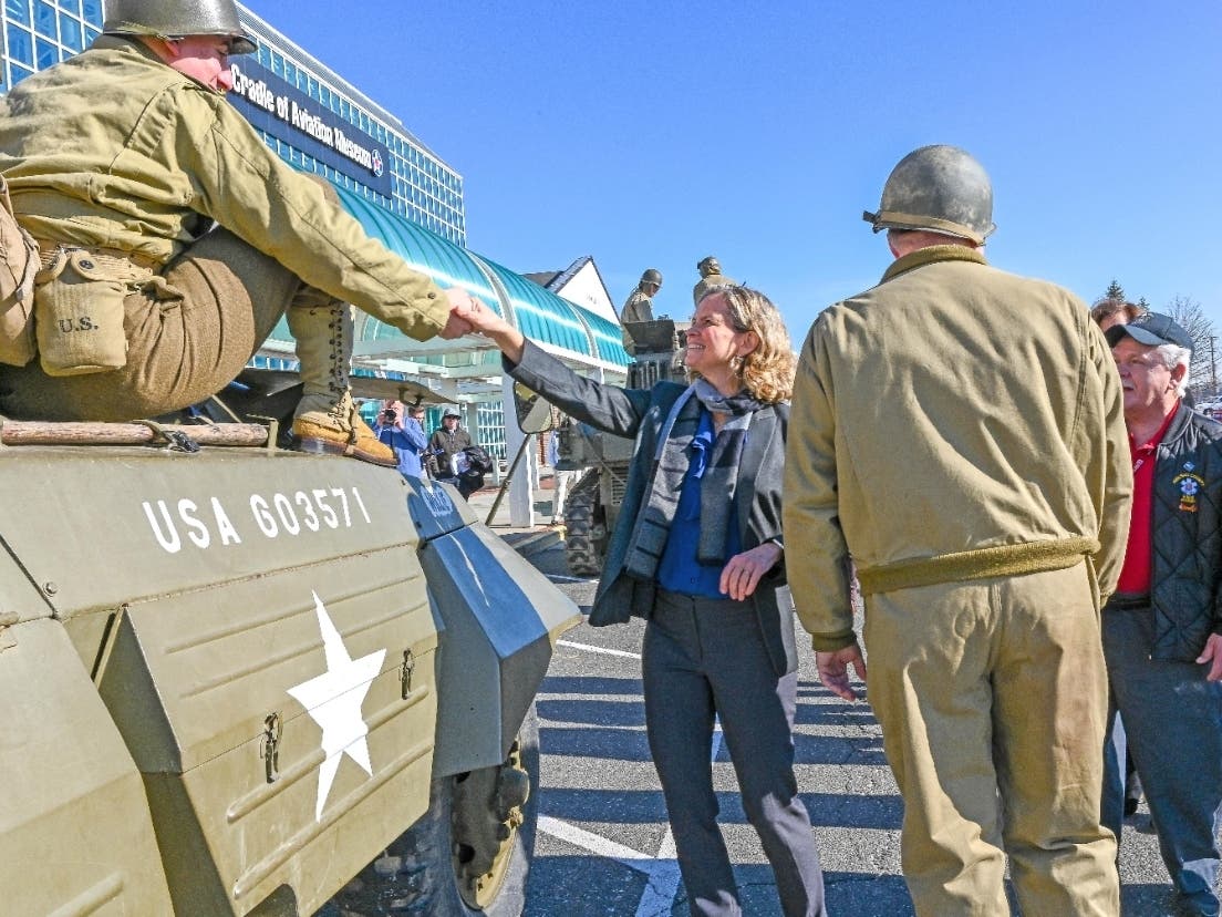Nassau County Executive Laura Curran greets living historians from the Museum of American Armor during a program at the Cradle of Aviation, Garden City, marking the start of a year long observance of the 75th anniversary of the end of WW II.