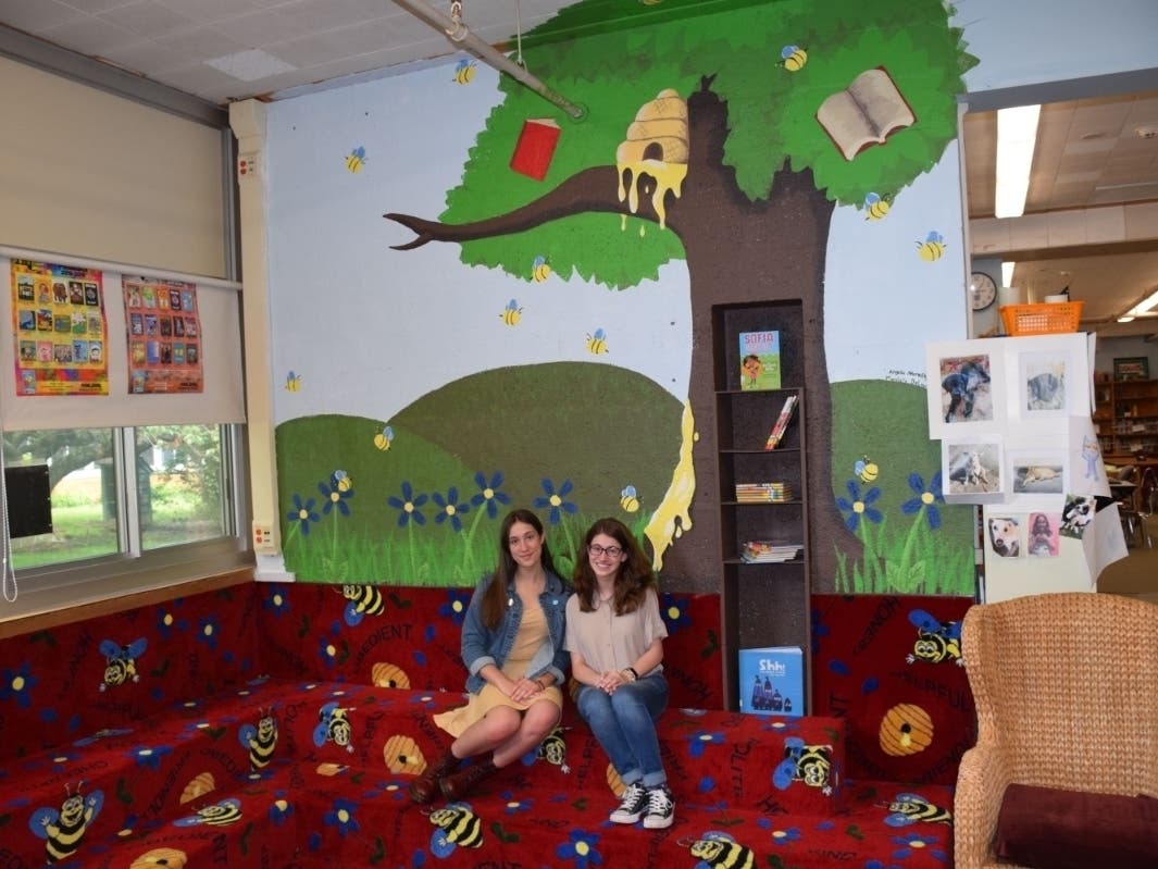 From Syntax: East Meadow High School students Angela Moresky, pictured left, and Marabelle DeLaurentis, pictured right, showcased their mural painting on the wall of the McVey Elementary School library on June 14. Angela designed the wall for a class project with Marabelle’s assistance and the help of McVey librarian Ellen O’Neill.