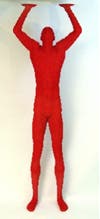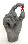Work by Nathan Sawaya is found in public and private collections including the National Marine Corps Museum, Neiman Marcus, New Orleans Public Library and The New York Times. The installation at Nassau County Museum of Art includes the eight-foot-high Pushing Against, a red figure with raised arms, and the five-foot high The Courage Within, a mostly grey work highlighted by a view into the figure’s red abdomen. Other works in the exhibition include Trapped, a two-foot-high red figure enclosed within a box; Strength of Spirit, a two-foot high hand holding a small human figure; and Goodbye, a two-and-a-half foot high erect grey figure losing its parts as it walks away.