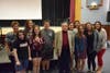 Image 1: Werner Reich (center) gathered with students and teachers following the second of two assemblies at East Meadow High School.