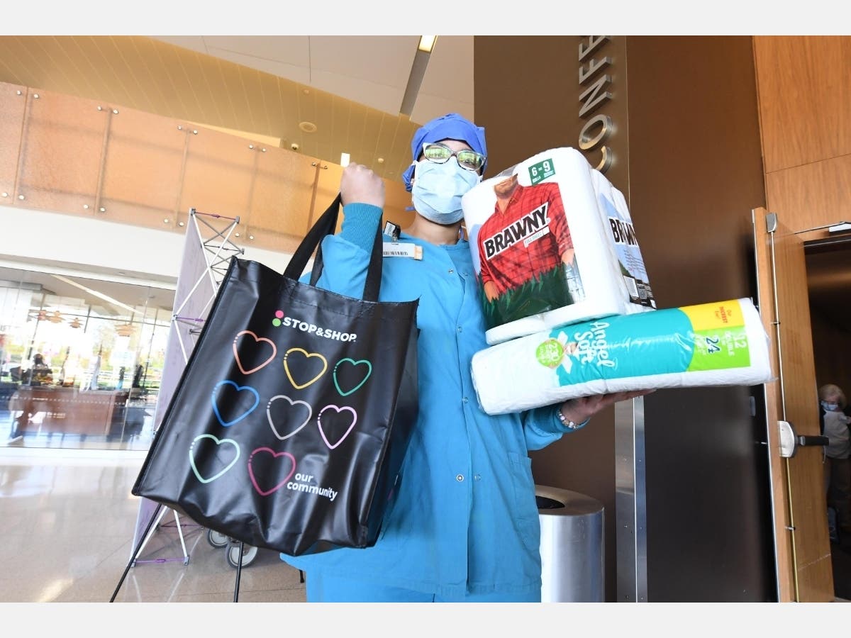 The Stop & Shop donation included everyday essentials such as paper towels, toilet paper, peanut butter, jelly, pasta, pasta sauce and cereal. The groceries were handed out to 500 healthcare workers at the hospital on Thursday and was met with incredible gratitude.