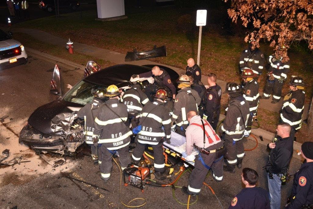 The car was mangled, with the driver trapped inside. Emergency crews worked together to remove both doors and the center post of the Honda to get the driver out. Both drivers were brought to Nassau University Medical Center, one in serious condition.
