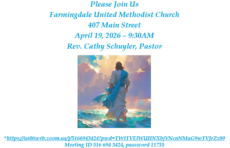 Farmingdale|Local EventSunday ServiceKaren Gierie Newman, Community ContributorApr19Event DetailsSun, Apr 19, 2026 at 9:00 AMAdd to calendarFarmingdale United Methodist Church, 407 Main St, Farmingdale, NY, 11735All are welcome!Share