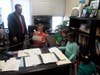 Photo 1: Farmingdale School District student “Principal Schneider” makes morning announcements at Saltzman Elementary School surrounded by peers and an administrator during his one day as principal. He was participating in a District initiative to teach students the value of responsibility.