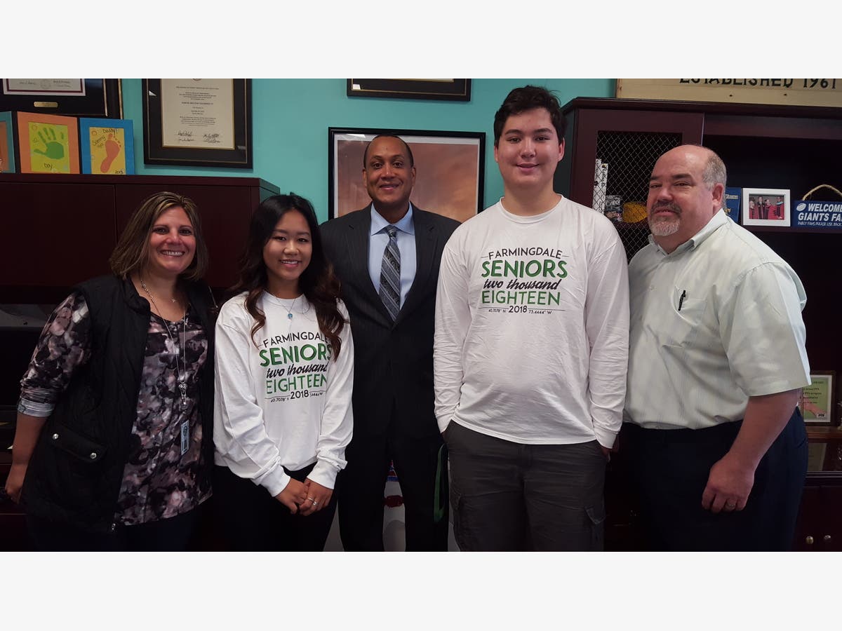 Pictured from L-R: Farmingdale High School Guidance Counselor Cara Molina, student Britney Pham, Principal Dr. Samuel Thompson, student William Huebner and Guidance Counselor Francis Mayerhofer.