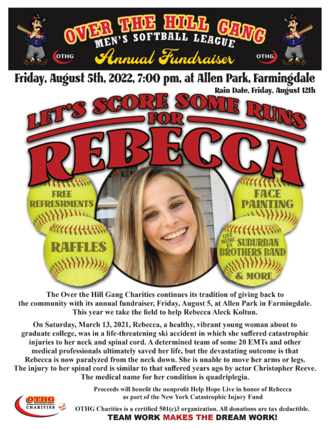 FARMINGDALE, NY — The annual fundraiser for the Over the Hill Gang Men's Softball League is scheduled for 7 p.m. on Aug. 5 at Allen Park in Farmingdale. The rain date is slated for Aug. 12.