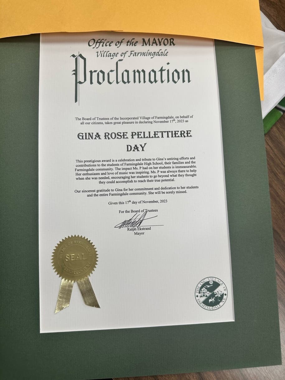 "This prestigious award is a celebration and tribute to Gina's untiring efforts and contributions to the students of Farmingdale High School, their families and the Farmingdale community," the proclamation reads. "The impact Ms. P had on her students is immeasurable. Her enthusiasm and love of music was inspiring. Ms. P was always there to help when she was needed, encouraging her students to go beyond what they thought they could accomplish to reach their true potential. Our sincerest gratitude to Gina for her commitment and dedication to her students and the entire Farmingdale community. She will be sorely missed."