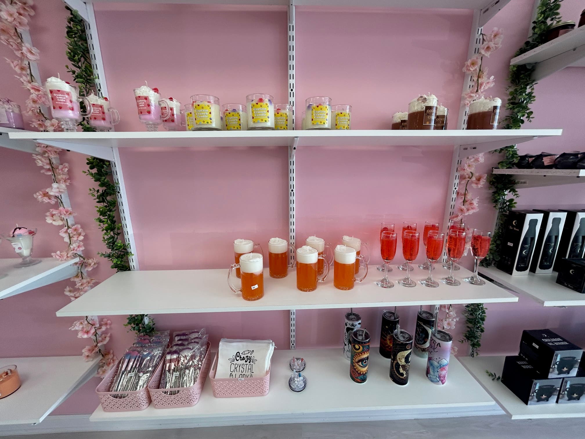 She sells crystals, candles, cups, colognes, perfumes and other accessories. The candles come in scents and designs like strawberry, marshmallow, Captain Crunch, cookies and cream, ice cream, and more.
