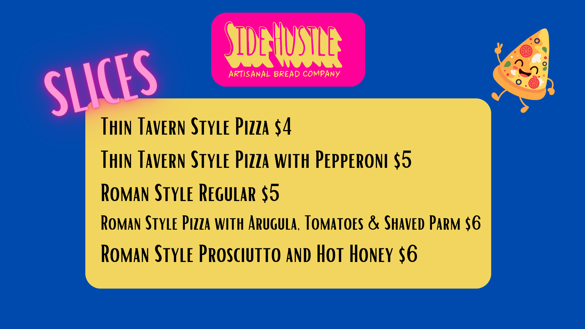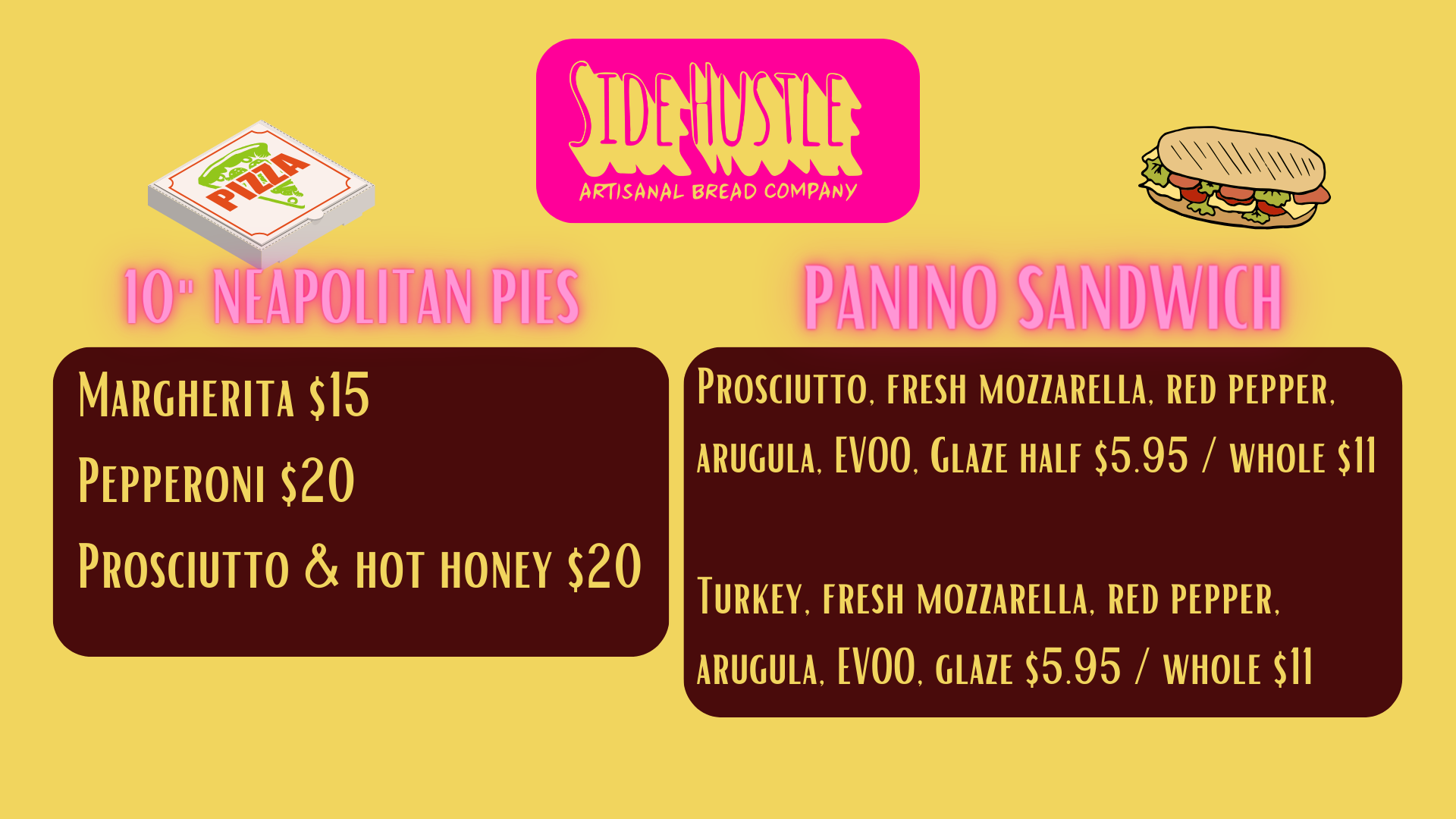 The Side Hustle Bread pop-up menu features bread loaves, panino sandwiches, and pizza. There will be slices and large pies, while Serpico eventually plans to add personal pies. He offers Neapolitan, tavern and Roman styles.
