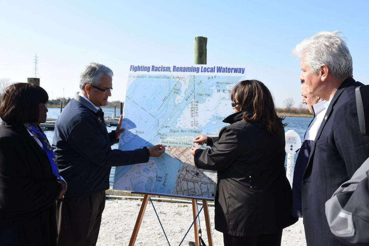 Town of Hempstead Supervisor Anthony Santino made the announcement Wednesday morning, standing on the banks of the channel with council members, and said the town was petitioning to have the channel renamed after fallen Inwood firefighter Joseph Sanford Jr. The town officials called the current name of the waterway, which straddles Inwood and Far Rockaway, an offensive racial slur that insults the diverse community surrounding the channel.
