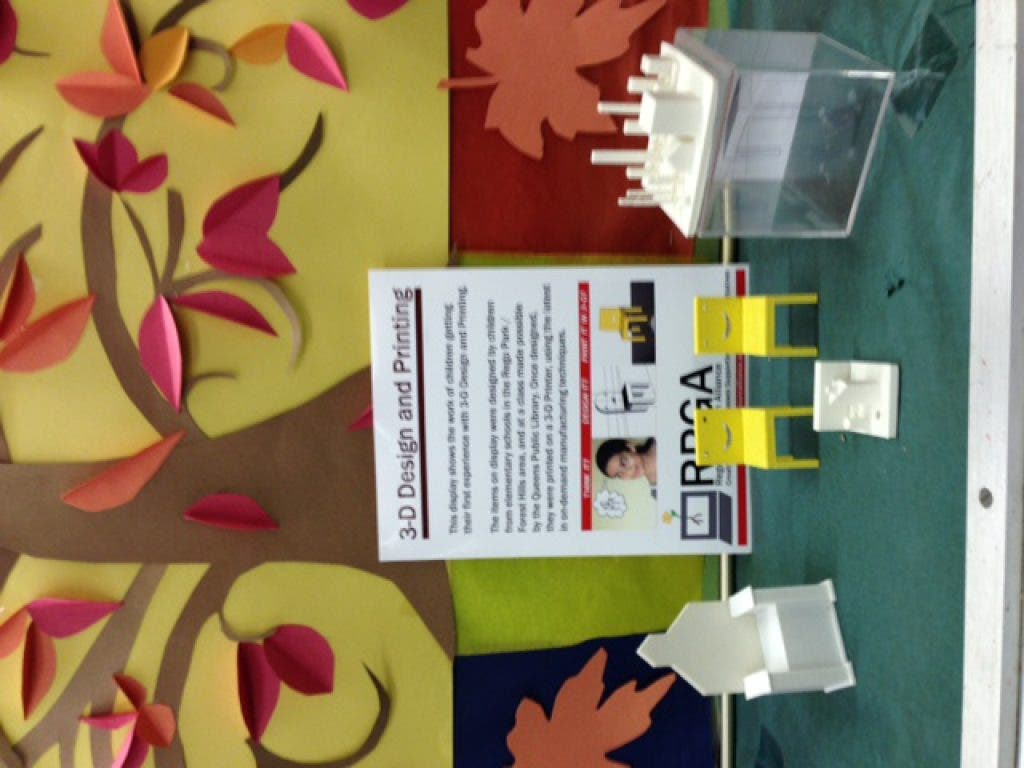 The Rego Park Green Alliance (RPGA), a non-profit organization focused on delivering creative technology classes that support community initiatives, is proud to announce that work from several of their students is on display at the Forest Hills Library. The exhibit is artistic and educational, highlighting new advances in 3-D printing that make it possible for kids to design and fabricate (print with recycled plastic) their imaginations.