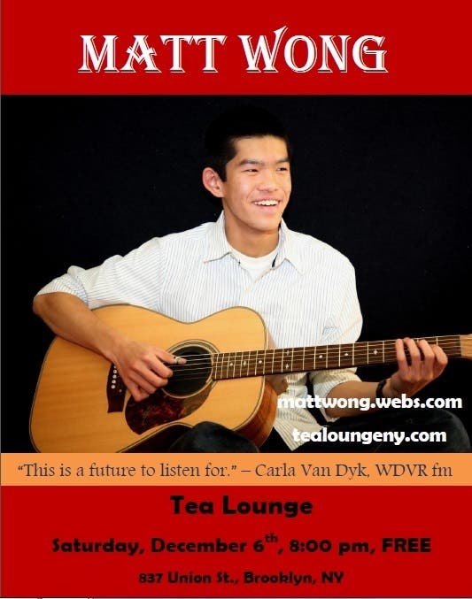 Teenage guitarist Matt Wong from West Windsor, NJ will perform in Brooklyn at the Tea Lounge on December 6th.