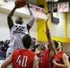 PHOTO CAPTION: LIU’s Nura Zanna soars over two Saint Francis, PA defenders for a basket.