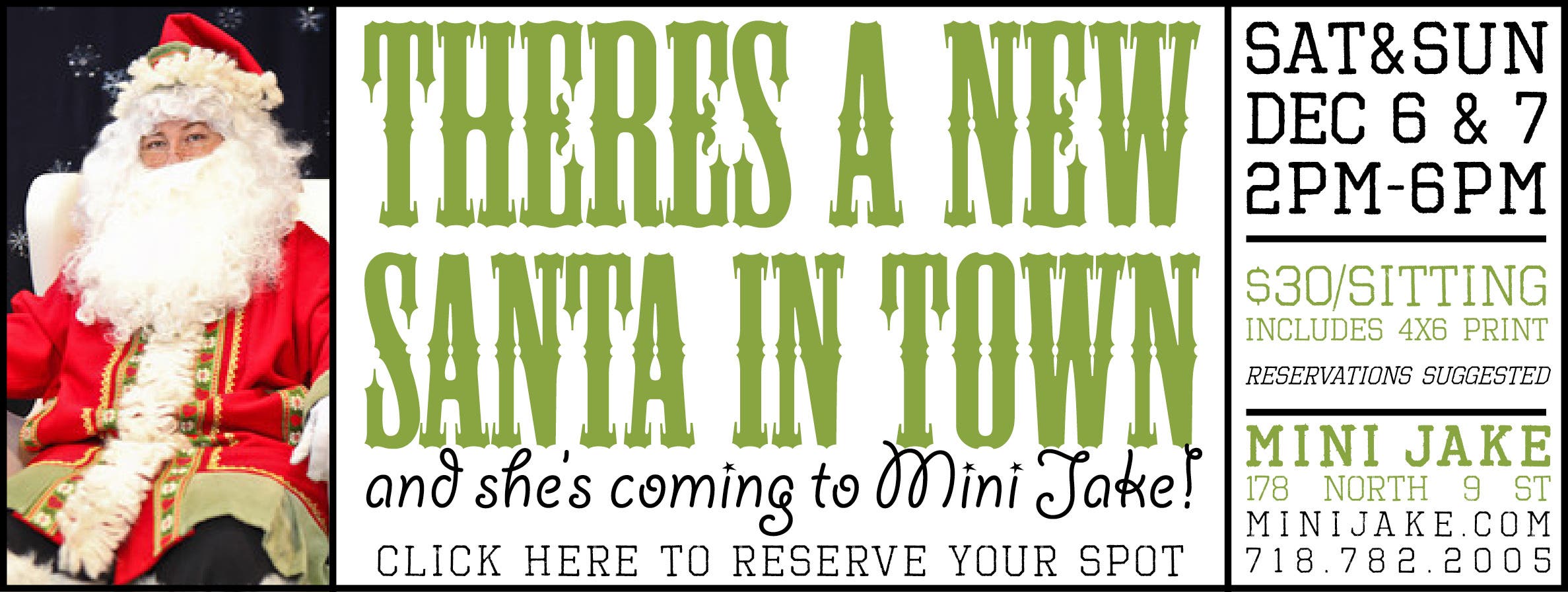 Mini Jake Santa Portrait Reservation 2014Mini Jake, Brooklyn’s premiere modern toy and furniture store, is welcoming Santa to Williamsburg from 2-6pm the weekend of December 6th and 7th. But unlike most, THIS SANTA IS A GIRL!