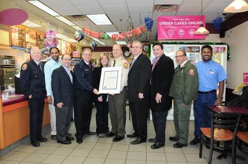 County Executive Ed Mangano officially thanked Biundo and his wife inside the Carle Place Dunkin’ Donuts. Alongside him were Chief of Patrol Frank Kirby, Dunkin’ Donuts Manager Shaan Javed, Operations Manager Lou Becktold, Acting Police Commissioner Thomas Krumpter, store owner Bret Nadler, AMT Commanding Officer Peter Timinell, and Ajay Lag.