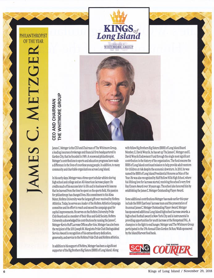 James C. Metzger, the CEO and Chairman of The Whitmore Group of Garden City, was honored as "Philanthropist of the Year" by the Long Island Press and its Schneps Community News Group last evening. The Whitmore Group is a leading independent insurance brokerage headquartered in Garden City.