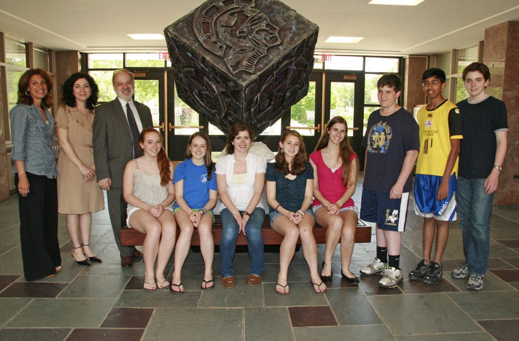 The 16 medal winners are: Jessica Wood (grade 10, bronze), Shannon Carman (10, silver), Emily Spain (10, gold), Drusilla Falco (9, gold), Kathleen Demaria (9, gold); (standing, left to right): Michael Cassano (9, gold), Nikhil Patel (10, bronze), and Matthew Conroy (10, bronze). Absent from the photo: gold medalists Christopher Saeli (10) and Annie Foxen (10), silver medalists Devan Oodal (10), Rich Pietrzak (11), and Courtney Studdert (10), and bronze medalists Danielle Ienna (9), Melissa Ross (9) and Jillian Giorgio (10).