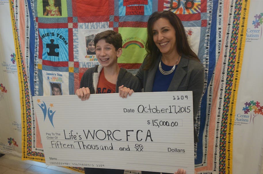 High school student Ryan Hason is shown presenting a $15,000 check during November to Janet Koch, Executive Director of The Family Center For Autism (thefamilycenterforautism.org) (Garden City). The funds were raised through creation of an “autism quilt” where attendees at the golf event contributed money.