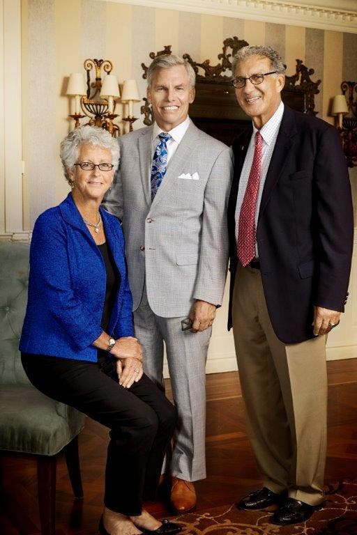 James C. Metzger, center, is joined by Nina Van Erk (Nassau County NYSPHSAA Section VIII executive director) and Jim Amen (Manhasset public schools director of health services).
