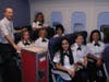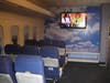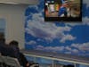 The 1,700-sq. ft. office is designed with three-foot curved laminate panels to simulate the interior of an airplane. Gaccione found a California supplier where they purchased 18 airplane seats with the correct fabric and color scheme for the room. Overhead, the ceiling has soffit boxes with recessed lighting. At the end of the room a big-screen television is mounted and surrounded by a cloud mural. Along the wall, portholes look out from the passenger's plane seat; toward the back are scenes in the sky and as you move forward the windows show the plane closer to the ground, then landing.