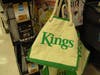 Kings sells reusable bags for 99 cents, as well as high-quality "fashionable" bags for $9.99. Customers who shop with 99-cent reusable bags get 4 cents off for each bag of groceries. On Sunday, Kings was out of stock of the 99-cent bags but had two stacks of the higher priced bags. Kings' disposable grocery bags are made out of recycled plastic.