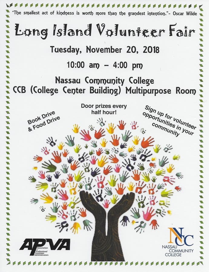 The 10th annual Long Island Volunteer Fair will be held at Nassau Community College from 10 am to 4 pm, Tuesday, November 20, 2018. Over 45 nonprofit agencies will be staffing exhibits in the College Center Building (CCB) Multi-purpose Room to recruit students, faculty, and community members for a wide array of volunteer positions. Opportunities include working with animals, youth or seniors, and helping at museums, soup kitchens, shelters, or health care facilities. Volunteers are also needed to join an emergency preparedness group, become an advocate for special needs, or protect the environment. Anyone, regardless of age, location, or resources, can accomplish amazing things when they take on the problems they see in their community.