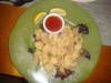 Despite the 80 degree weather, I started with the soup special, Tomato Bisque ($4.50). A complete soup snob, I was enormously pleased with the complex flavors hidden in the velvety bowl of pureed tomatoes, cream, sherry and basil. The Baby Sister is predictable and went with the fried calamari. We were pleasantly surprised went it arrived with a Thai/Asian themed sweet and spicy sauce. It was delicate, not chewy. It was served with slices of lemon. Skip them and go with sauce.