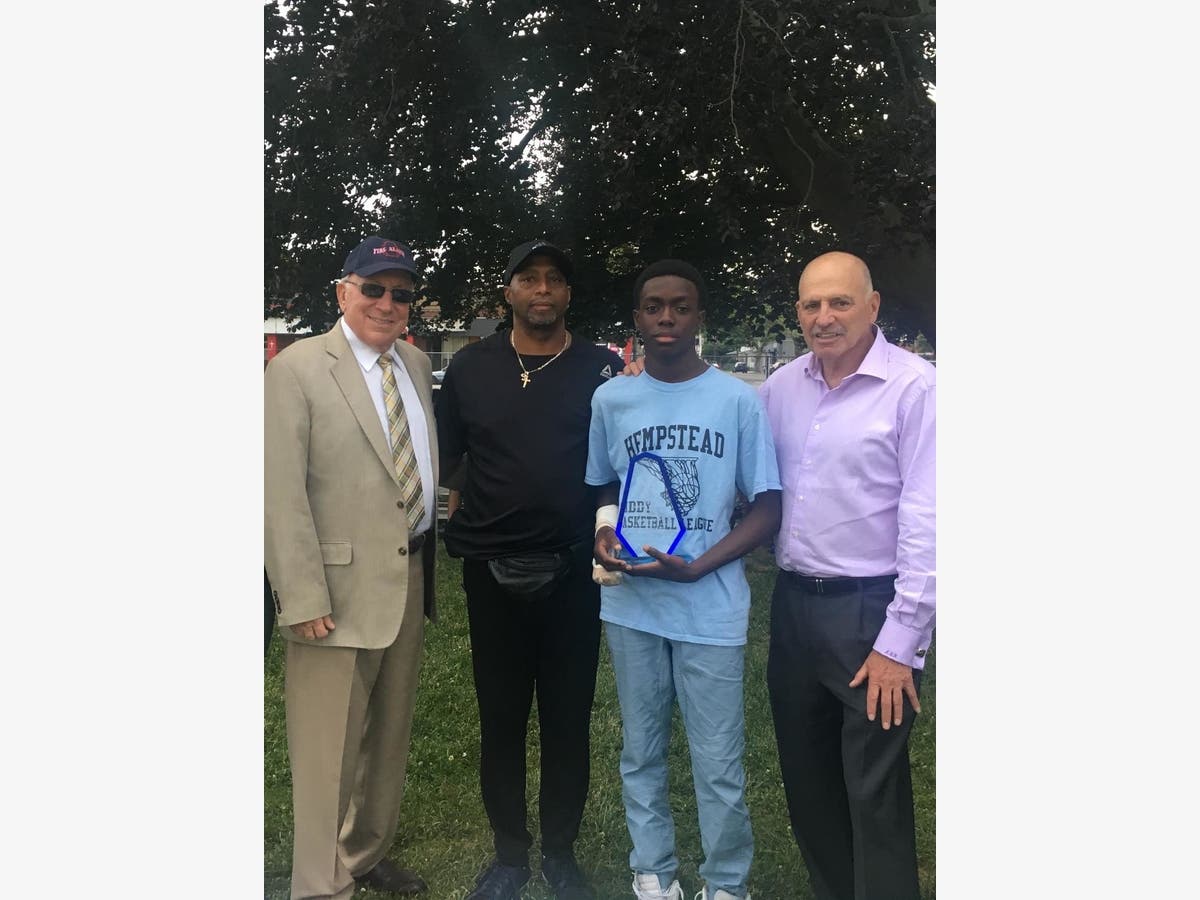 Photo: The recipient of the James C. Metzger Award is Josh Garrett. Pictured with Garrett are, from left, Village of Hempstead Mayor Don Ryan, the award winner’s father Jerome Garrett and Coach Alan Hodish. Courtesy of Hempstead PAL