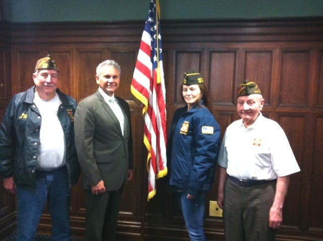 Image via City of Glen Cove (L to R): Joseph Lavery, Commander VFW James Donohue Post 347, Glen Cove Mayor Reggie Spinello, Veteran Day Honoree Master Sergeant Christina M. Noon and World War II Veteran and former POW, Lou Noon, Christina’s father.
