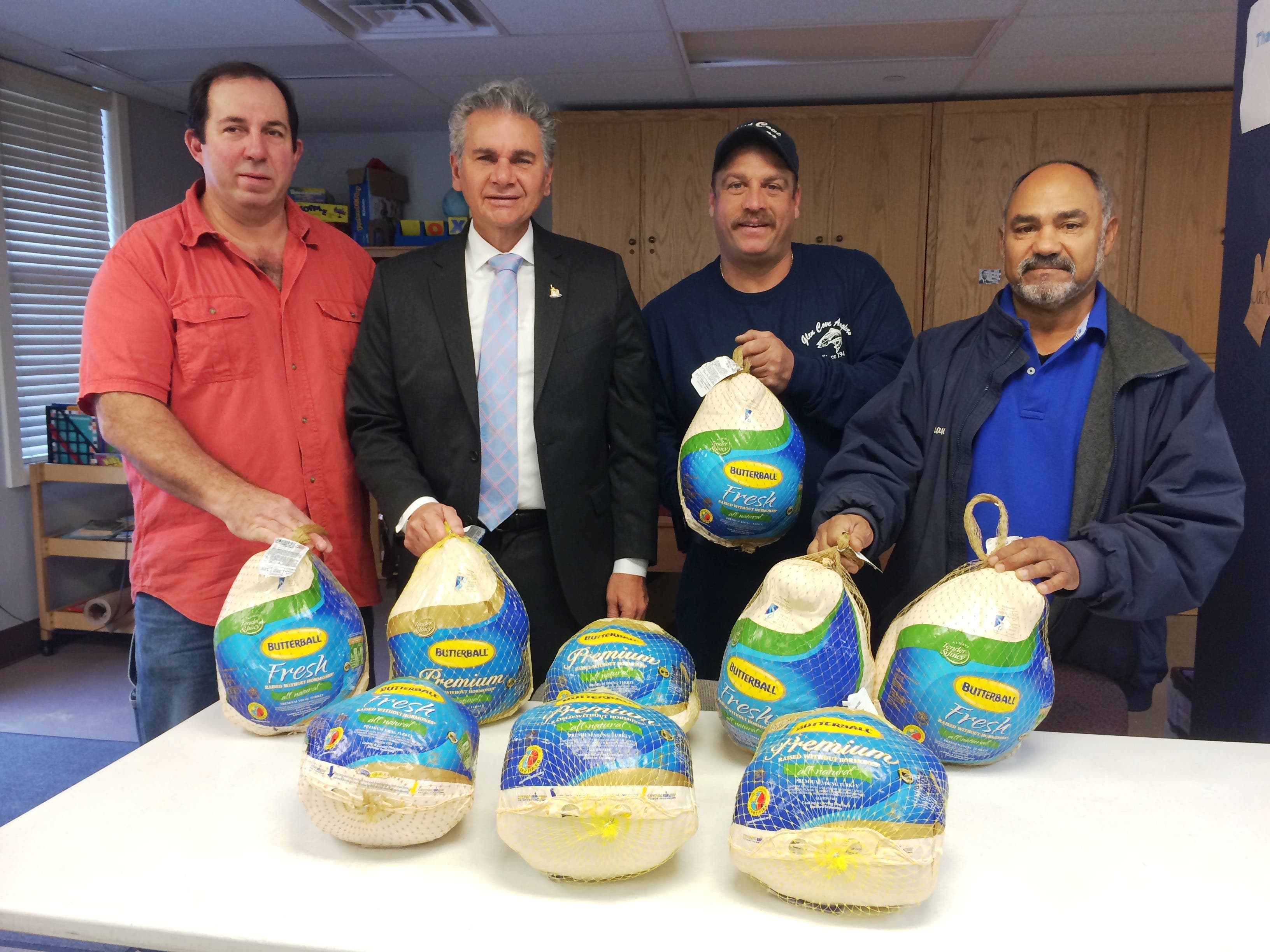 Commodore Sal Groe, Anglers Club members Phillip Ferrante and Frank Pena are pictured with Mayor Reginald Spinello as they prepared to deliver the turkeys to the Youth Bureau.