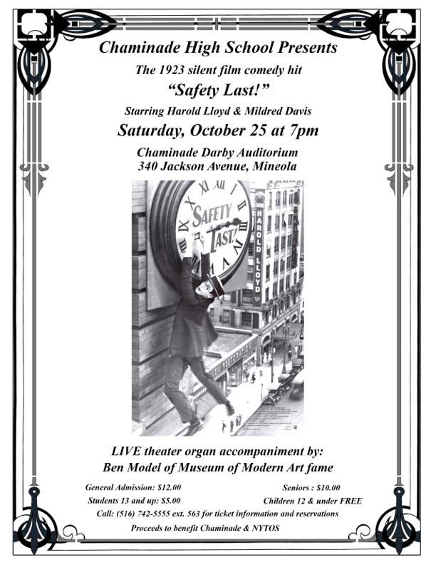 The 1923 silent movie comedy classic, “Safety Last” will be presented with live theater organ accompaniment by Ben Model, a nationally-acclaimed organist, on Saturday at 7 p.m. at Chaminade High School in Mineola.