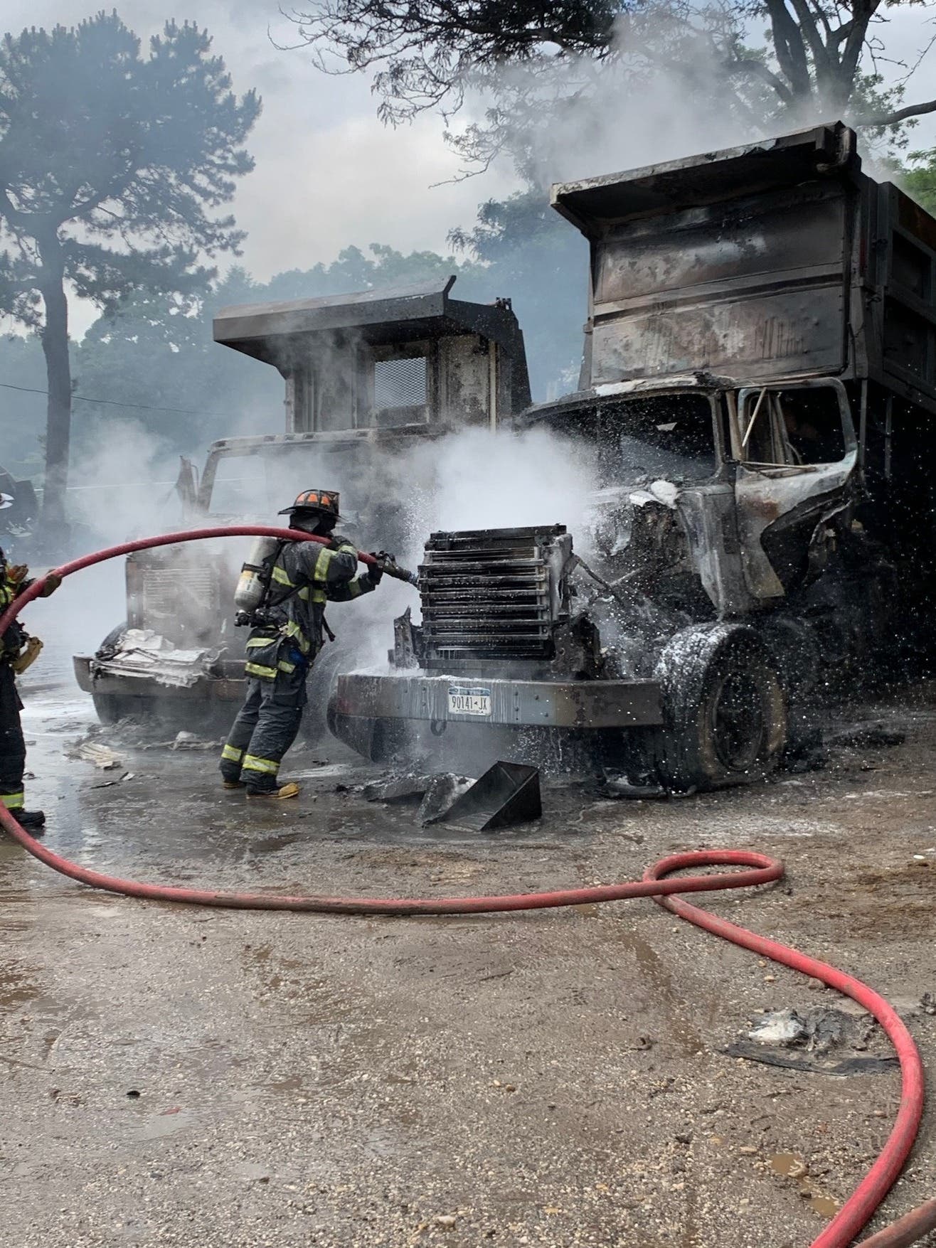 MELVILLE, NY — Two dump trucks burst into flames Thursday afternoon at a Melville plant nursery. The Melville Fire Department was called to North Service Nursery, at 25 North Service Road, around 3:20 p.m., public information officer Steve Silverman said.