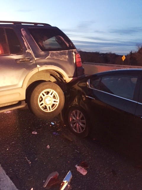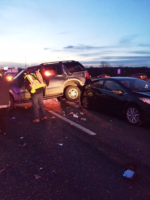 According to fire officials, the three-car collision occurred on the eastbound side of the LIE in Melville, just east of Round Swamp Road, at 7 p.m. Officials say a Ford Expedition rolled and landed on top of another car in the crash.